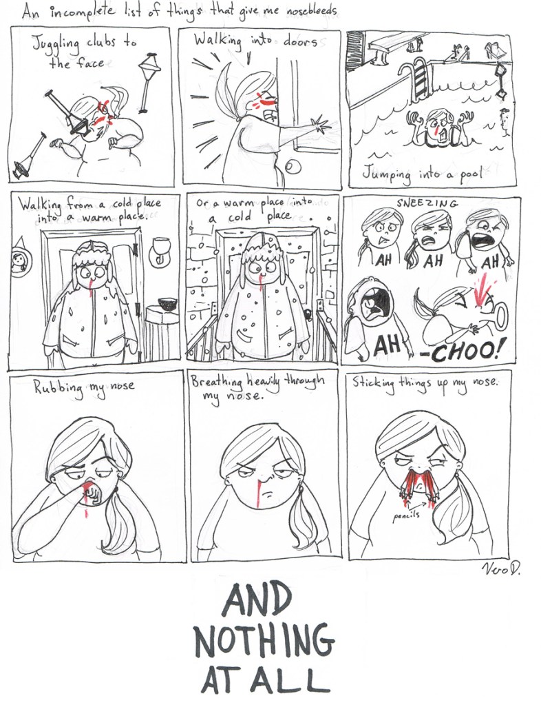 I was the nosebleed kid at school. Every school has one, I was mine. I used to have to drag the class garbage can to my desk so I could bleed nasally while doing my classwork. Later, I became a nosebleed adult, discovering new ways to make my nose bleed. Ah, memories.