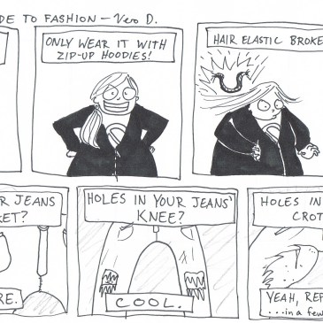 Funny story, I still have the T-shirt I reference in panel 1, but I ended up having to cut the sleeves off completely because the armpit holes were so big. Follow me for more fashion tips. From the archives – originally posted January 21, 2014.